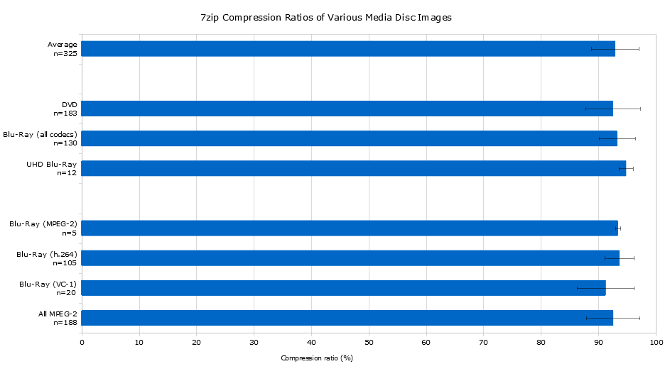 Imaged disc types include DVDs containing MPEG-2 media, Blu-rays containing predominantly h.264 media in addition to some MPEG-2 and VC-1 media, and UHD Blu-rays containing HEVC media. Somewhat superior compression ratios were achieved while compressing DVD images compared to Blu-ray and UHD Blu-ray, but no particular disc type or codec was found to result in compression ratios significantly different than the average of all disc images. This is likely due to the ISO file format itself, since the compression ratios of the images are noticeably better than the compression ratios of extracted video files stored in a Matroska container format.