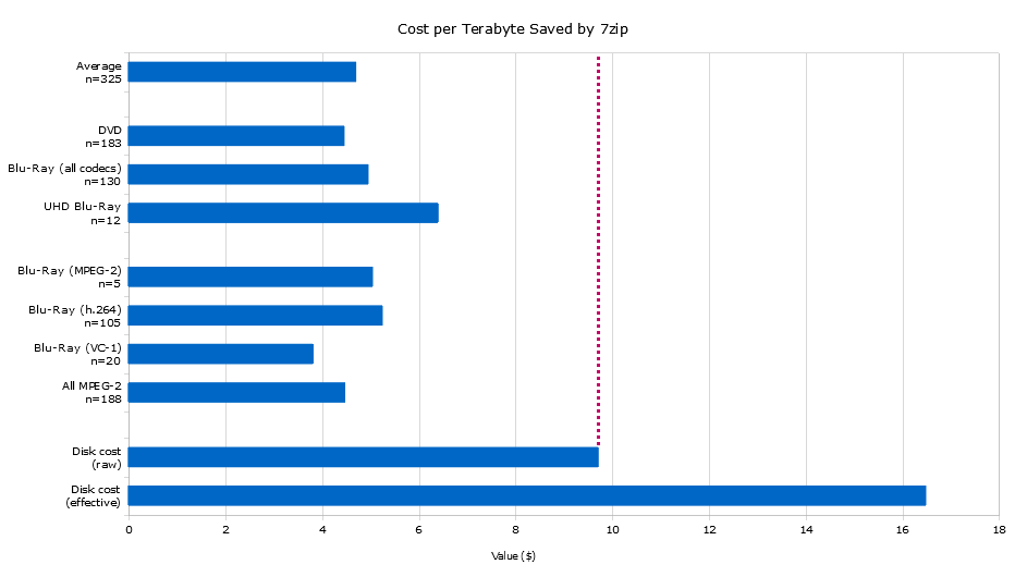 Meanwhile, cheaper disk space is not really available. Particularly good sales on HDDs are generally no less than $9 at this point. The cheapest HDDs I've ever seen were 8 TB external Seagate HDDs on clearance at Costco for $6.63 per terabyte with sales tax. This is still slightly more expensive than the value of disk space saved by compressing UHD Blu-ray ISOs ($6.40), which were the least compressible images. Any backups, parity, redundancy, etc. will increase the effective cost far beyond $6.63 per terabyte.